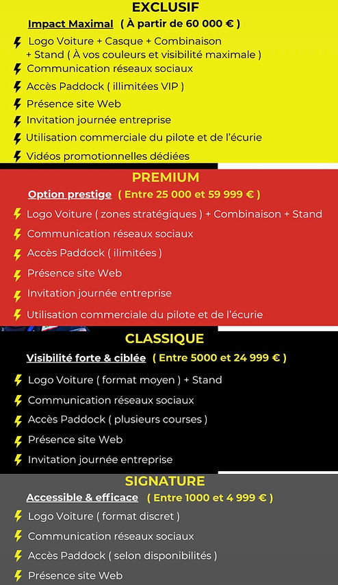 Si vous aussi vous voulez rejoindre l'aventure en devenant partenaire et afficher vos couleurs voici quelques packs qui sont proposés pour les entreprises.